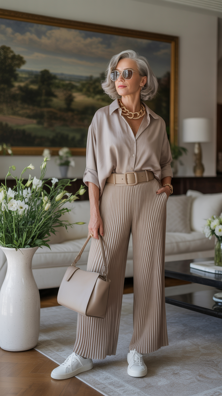 Длинное колье выступает в качестве акцента и не перегружает образ, а большие солнцезащитные очки помогают лучше передать настроение. Мне всегда нравилось, как подобные аксессуары могут превратить простой силуэт в образ с подиума, но при этом не испортить его. Это вполне соответствует тренду на повседневный шик среди женщин старше 50 лет, когда смелые решения сочетаются с продуманным кроем.