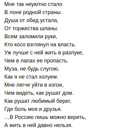 Это уже был не тот человек, который гордился успехами страны и пел ей гимны. Он чувствовал себя осколком прошедшей эпохи и отмечал, что в этой лучше жить не стало. Наоборот!