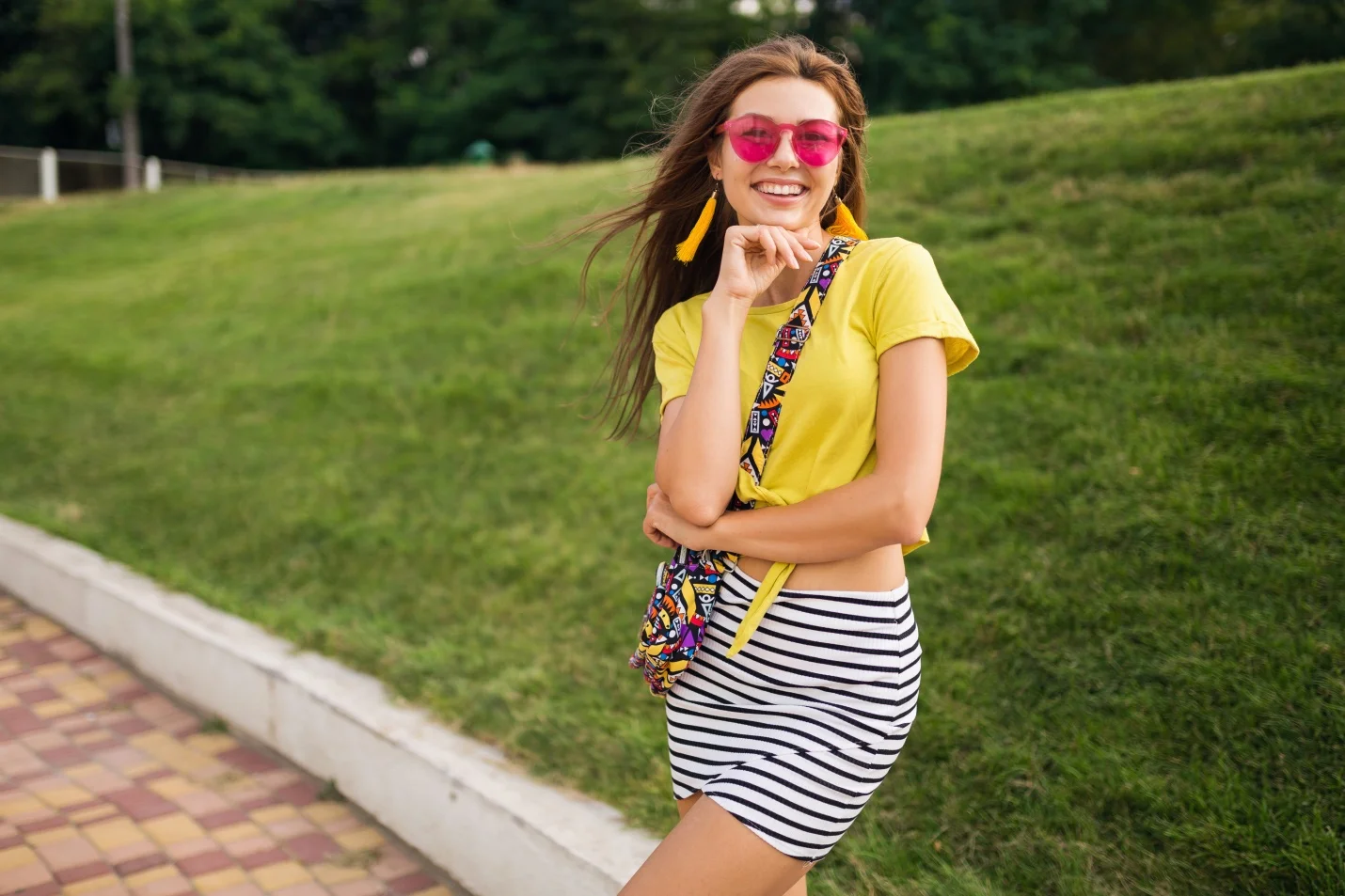 Белый топ и солнечные жёлтые шорты — простой и изысканный летний образ. Добавьте чёрные очки и небольшую сумку для лёгкого европейского шика.
