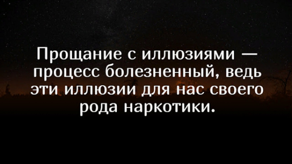 Какие могут быть иллюзии у человека? Убеждение, что близкие люди никогда его не предадут. Что любовь будет длиться вечно. Вера в то, что завтра будет лучше, чем вчера. Что силы не покинут, что деньги заработаются. А никто нам не обещал молочных рек и кисельных берегов.