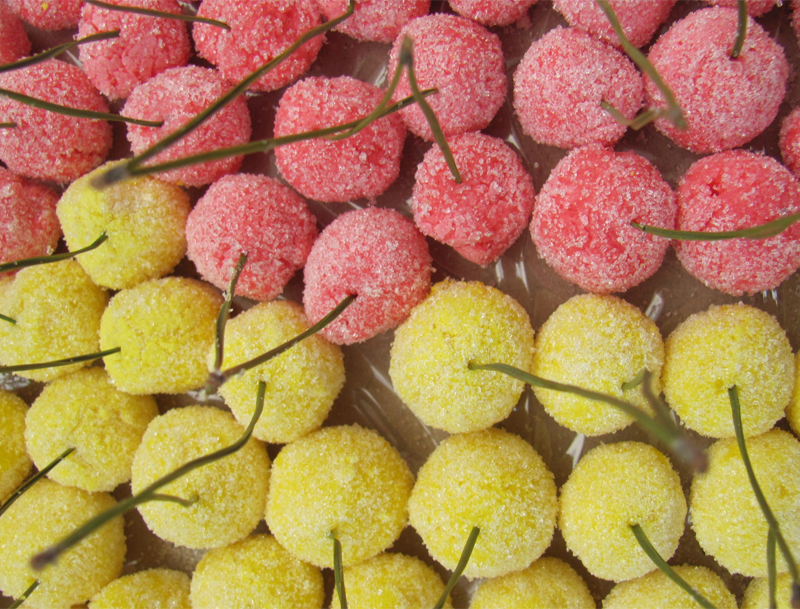 - В свекольный сок добавь 0,25 г лимонной кислоты. Возьми каждую вишню за хвостик и обмакни в сок на 2–3 секунды. Обваляй ягоды в сахаре и выложи на поднос, посыпанный сахаром. Поставь в холодильник для застывания.
