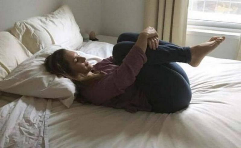 Сядьте на кровати, и выпрямите ноги. Вдохните, выдохните и тянитесь к пальцами ног. Вдохните снова, выдохните и потянитесь еще больше. Тяните шею тоже. Сделайте 10 повторений, и расслабитесь.