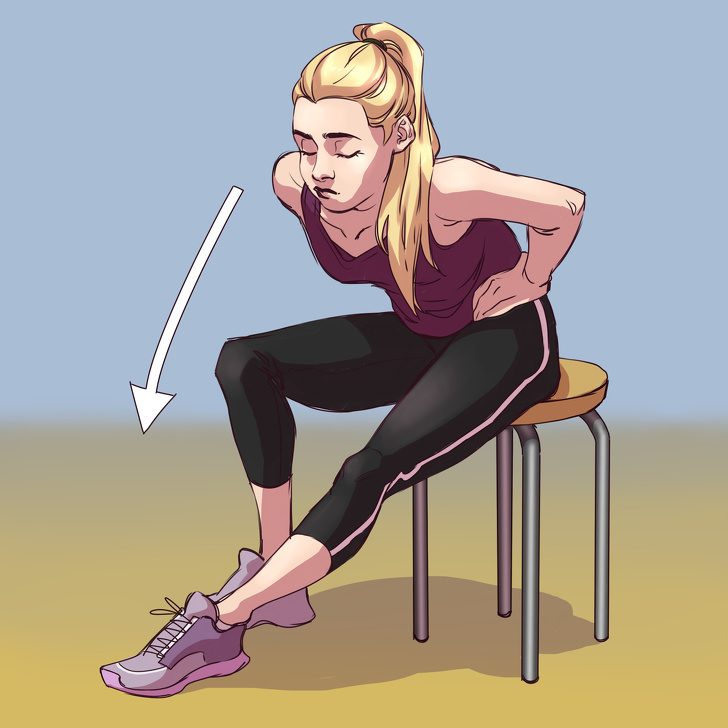 Упражнение для офиса. Сядьте на край стула и вытяните одну ногу вперед. Медленно наклоняйтесь корпусом к ноге. Не переусердствуйте: вы не должны чувствовать боль и напряжение. Сделайте 5–10 повторов и выполните это же упражнение на другую ногу.